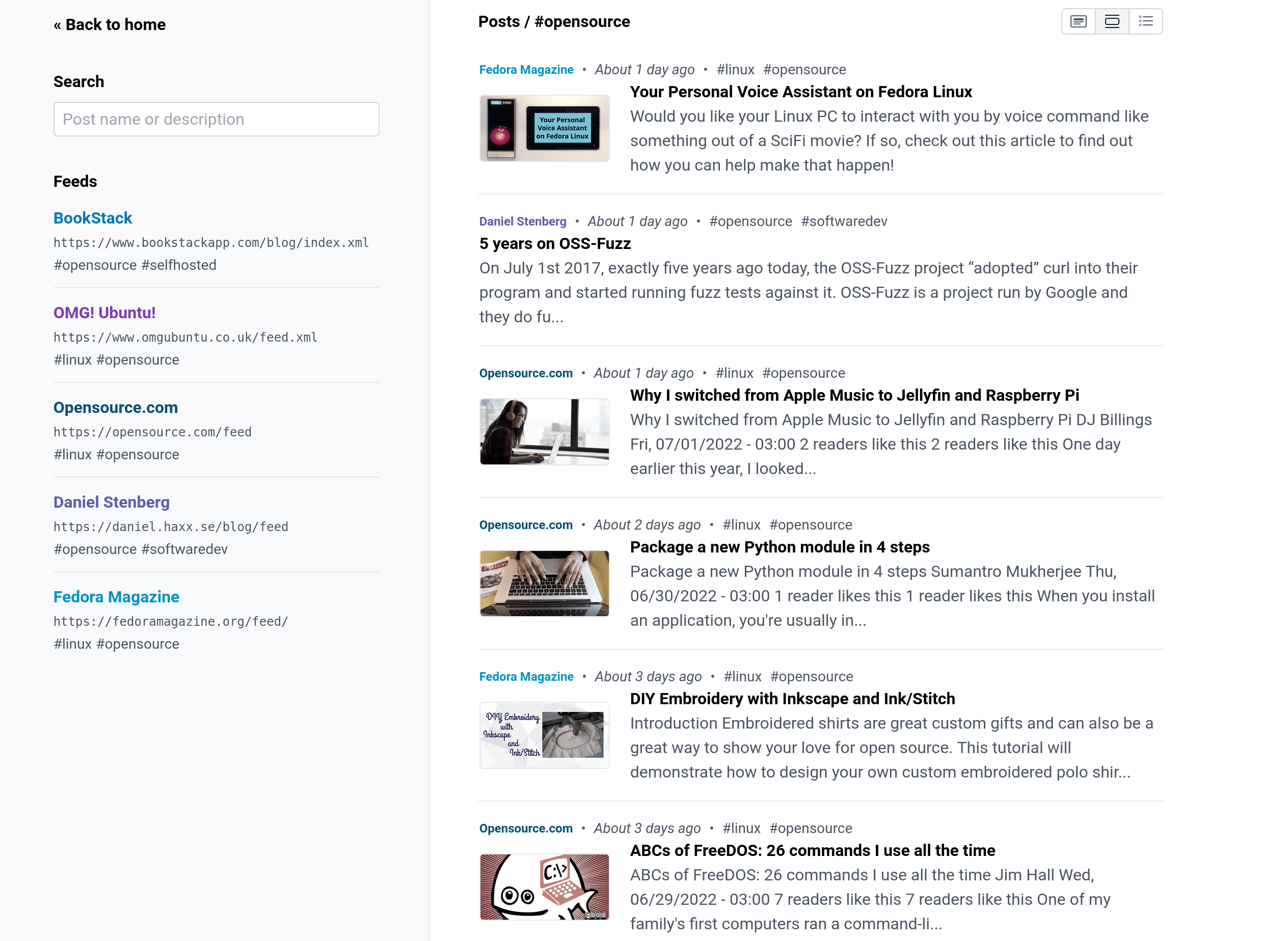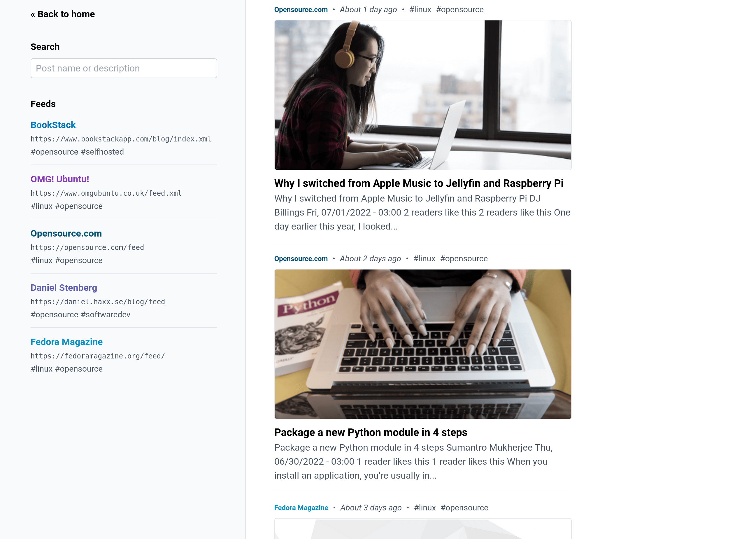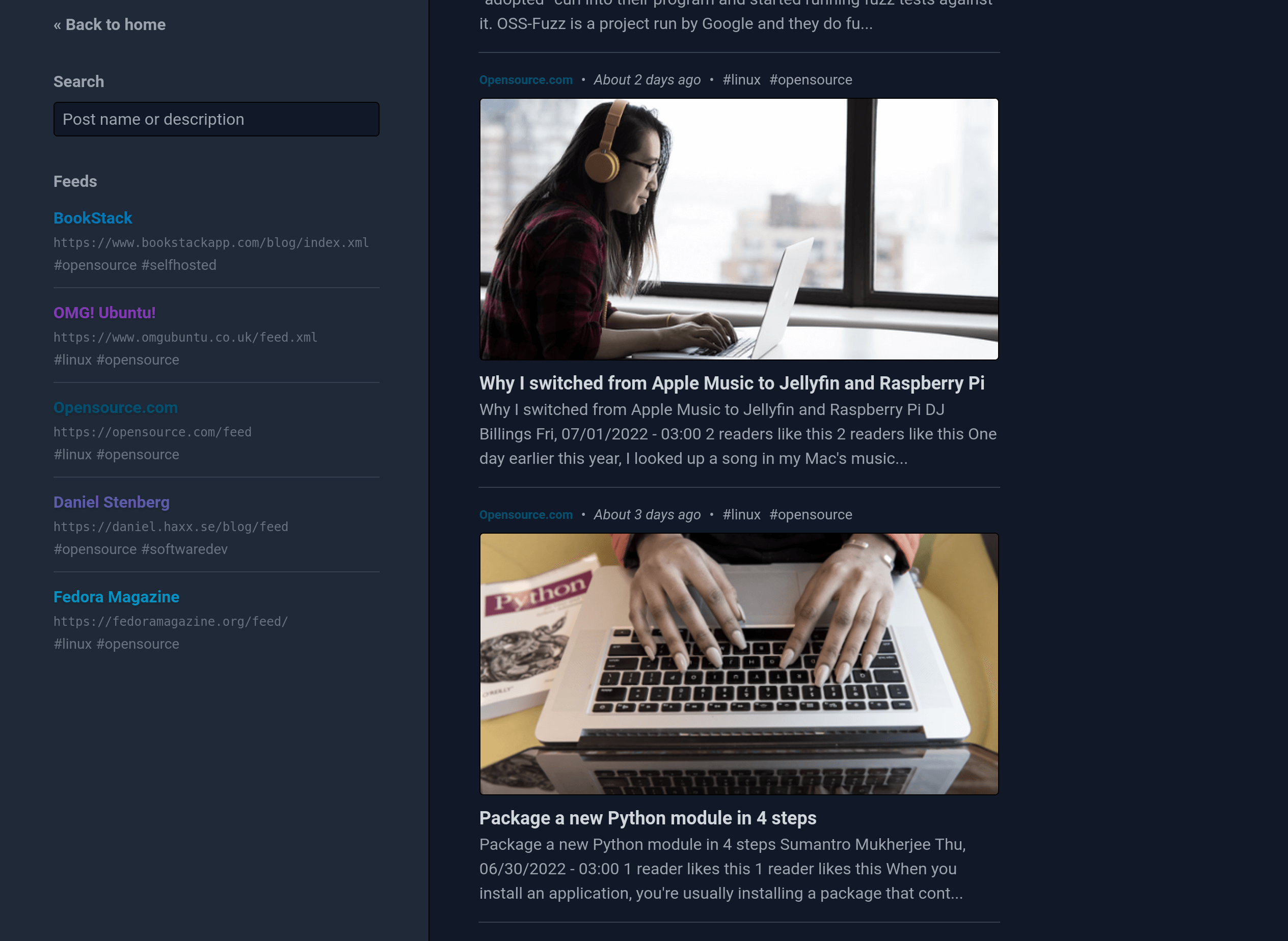 ghcr.io/ssddanbrown/rss:latest In the below docker-compose.yml example, the application will be accessible at http://localhost:8080 on the host and the files would be stored in a ./rss-files directory relative to the docker-compose.yml file. In this example, feeds would be configured in a ./rss-files/feeds.txt file.
