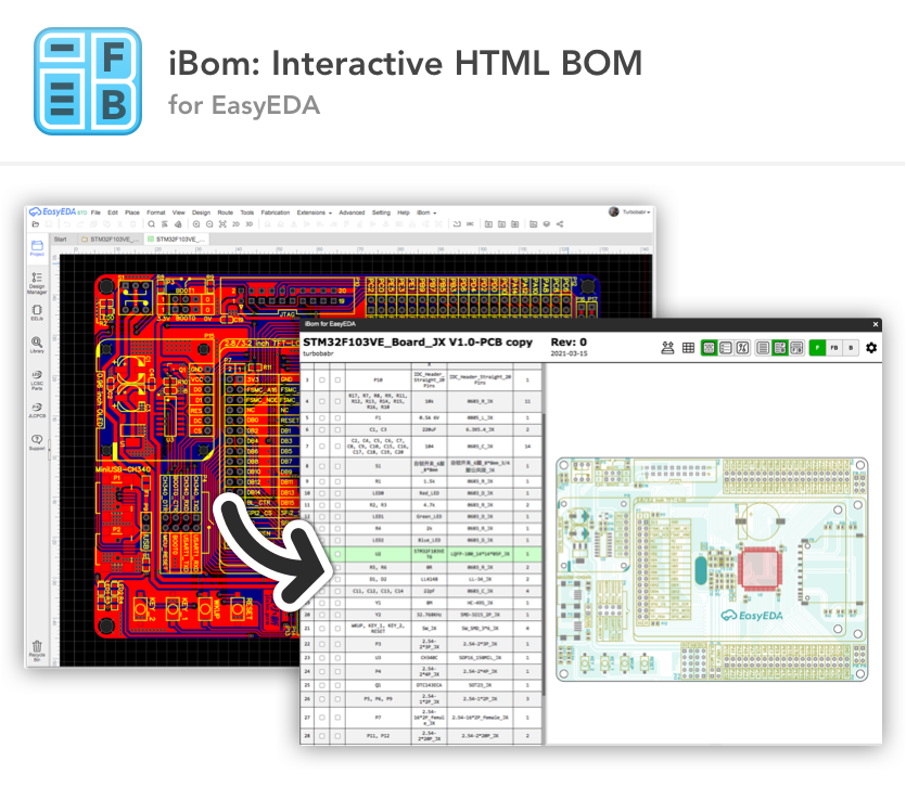 iBom for EasyEDA is a native extension for EasyEDA and LCEDA: Standard Edition. It is based on the awesome project called InteractiveHtmlBom designed and built by qu1ck.